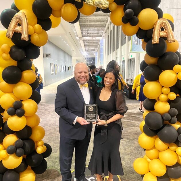 Receiving on behalf of the university are (pictured from left to right): Dr. Walter T. Tillman Jr., Hampton University Vice President, Chief of Staff and Associate Professor of Education and Tiffany Velez Rodgers, Hampton Proton Marketing Director.