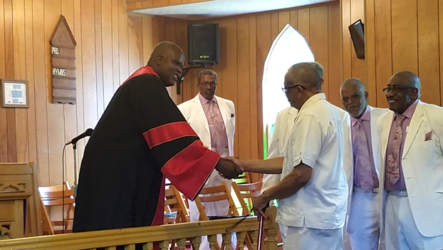 Pastor Williard Maxwell speaks with his congregation at New Beech Grove Baptist Church in Newport News, Va.